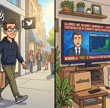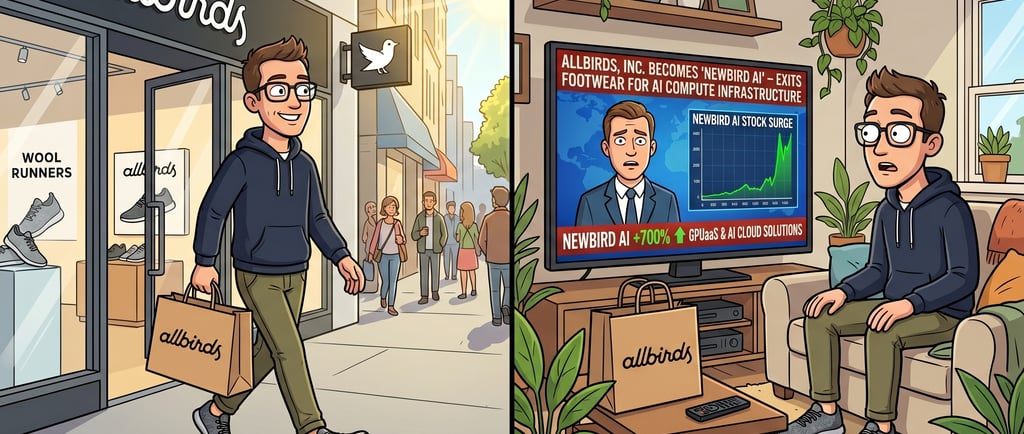 The wool sneaker brand, once valued at $4B (but more recently worth about $21M) will rebrand as "NewBird AI" and pivot to AI compute infrastructure. The stock jumped 582% in a day. The funny thing is... we've seen this movie before.