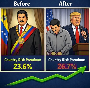 Let's say you're valuing a company with meaningful Venezuela exposure. Yesterday's model used a 15% discount rate. Today, country risk might push that to 20%. Same cash flows. Same growth assumptions. But equity value could drop 20%+ purely from the repricing of risk.