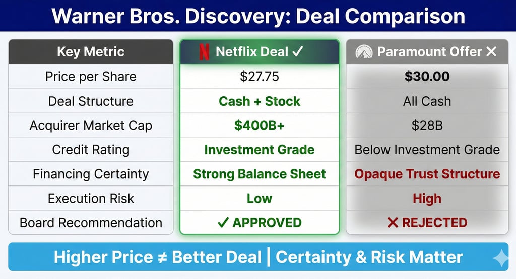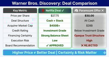 At first glance, this seems counterintuitive. Why reject $30 in cash when Netflix is offering $27.75 (in cash and stock)? But the board concluded that certainty, financing structure, and execution risk matter just as much as headline price.